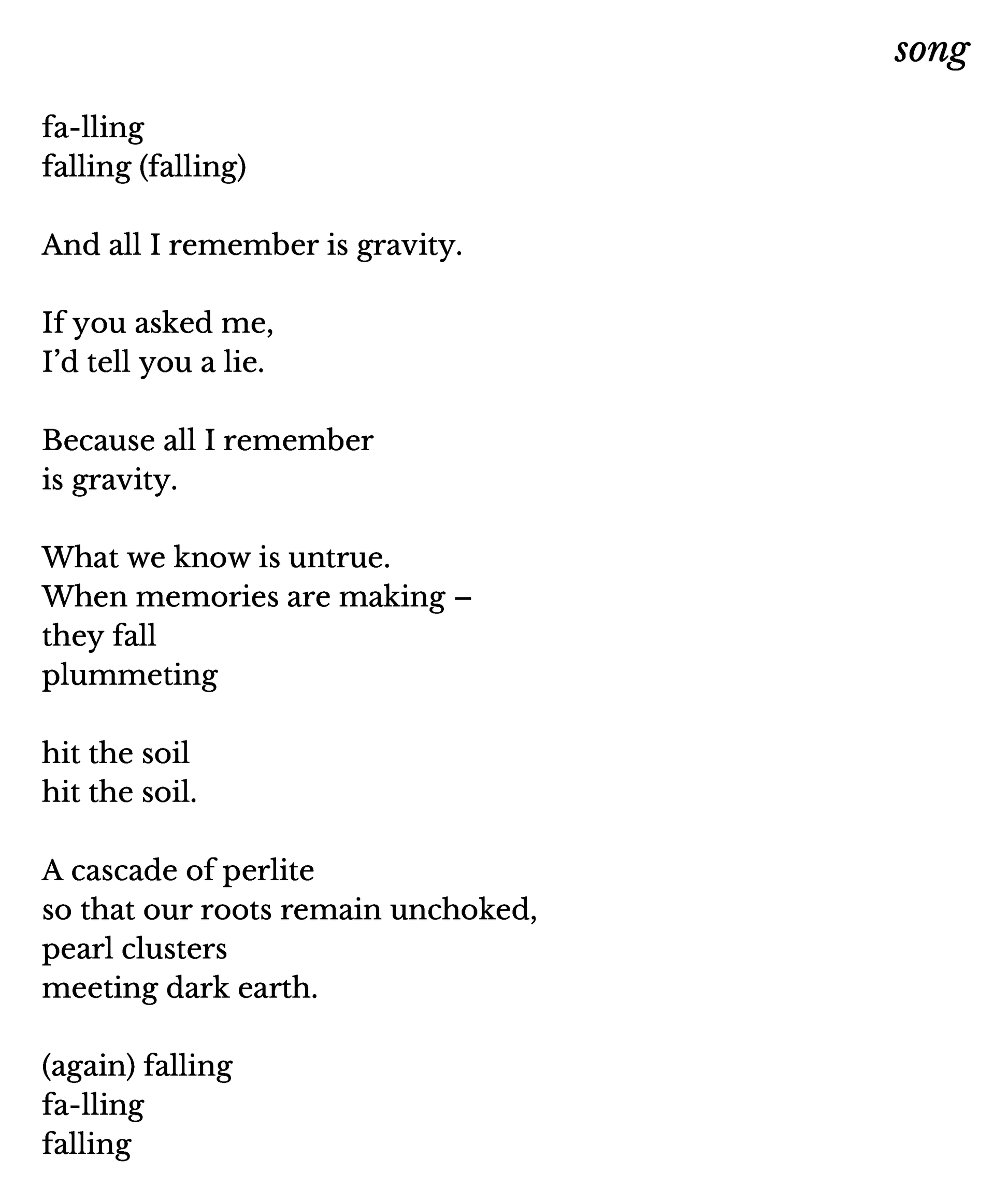 Before I learned that Dani Cole was a writer, I knew of their work in dance and improvisation. between heart and sap speaks the language of a body continuous with other beings of Earth, not one claiming dominion. As suggested in their poem, “untitled,” Cole allows the sensibilities of bodies to reimagine, reshuffle, and ultimately transform the way we read and understand. There’s a deliberate, surreal choppiness to this poetry’s sound and sense, an anti-rhythm keeping Cole’s readers alert, on edge, unable to settle into any comfortable roll. These roughly cut poems sport textures of bark and bumps of bone beneath skin, not the flat smoothness of elegant marks on paper. Their lines are puzzle pieces firmly brushing your hand aside as they gather themselves according to their own lights.
